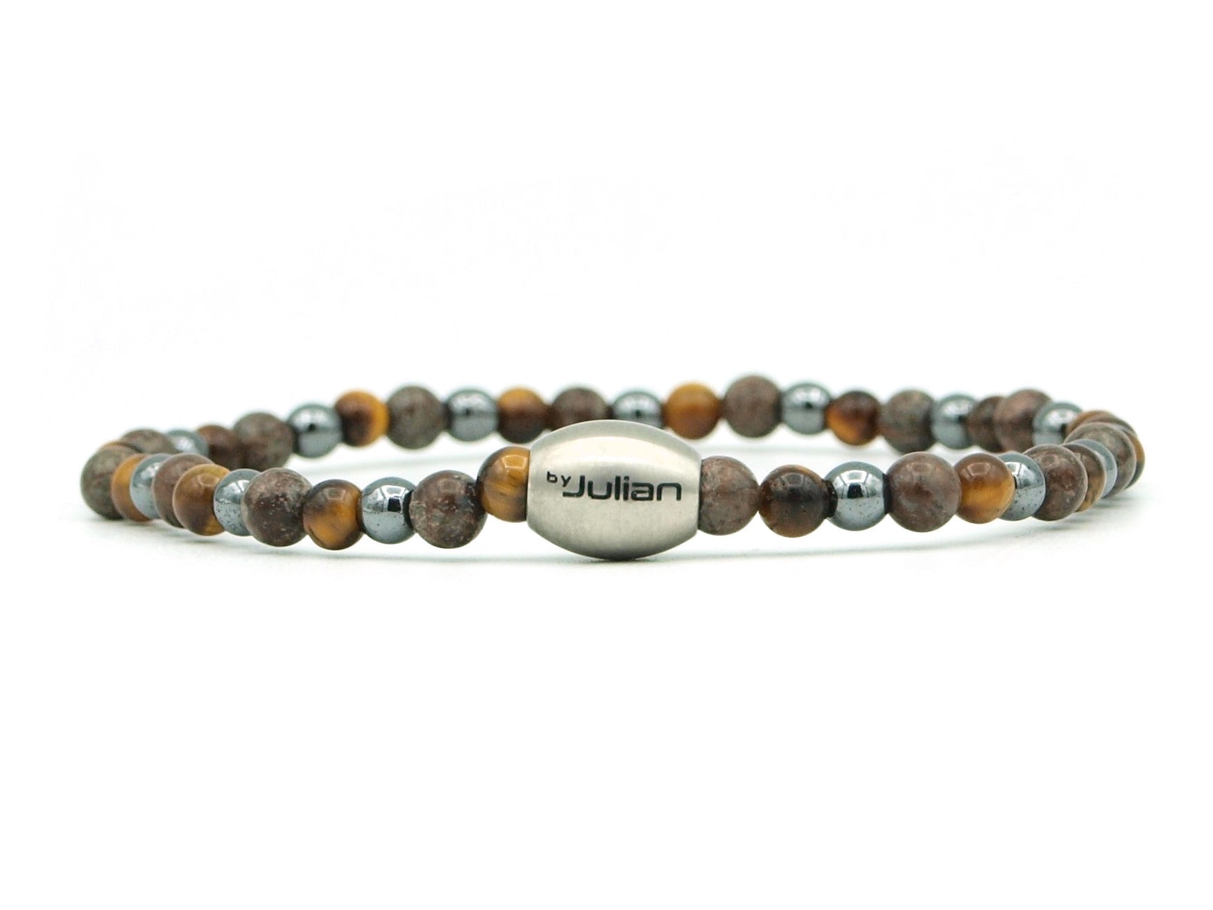 Deze armband is gemaakt van verschillende 4 mm natuursteen kralen in de kleur bruin en afgewerkt met een by Julian stainless steel logokraal geregen op sterk elastisch nylon draad.