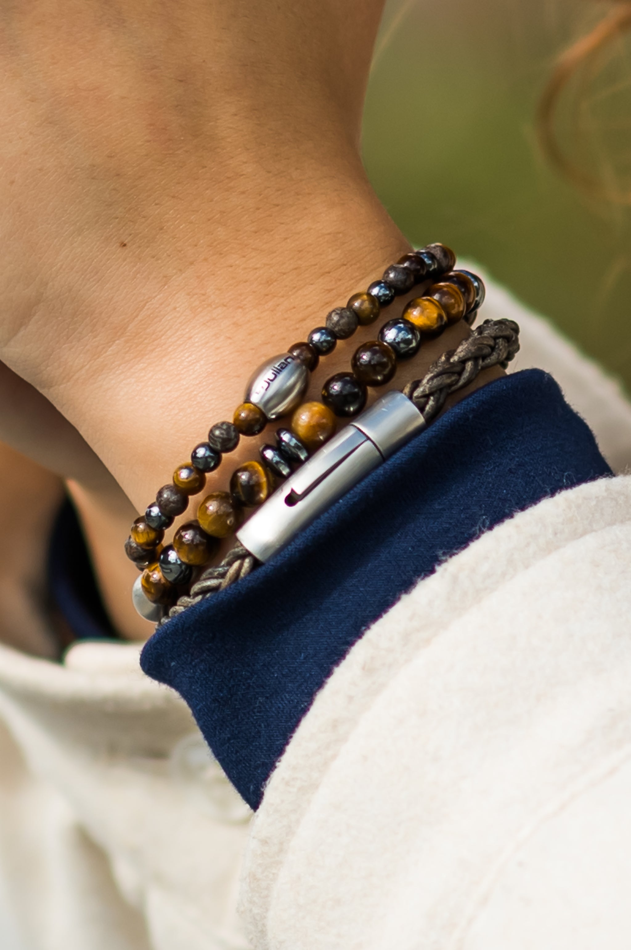 Voor onze armbanden gebruiken we verschillende soorten materialen. Veelal werken we met leer, hout, natuursteen en RVS.