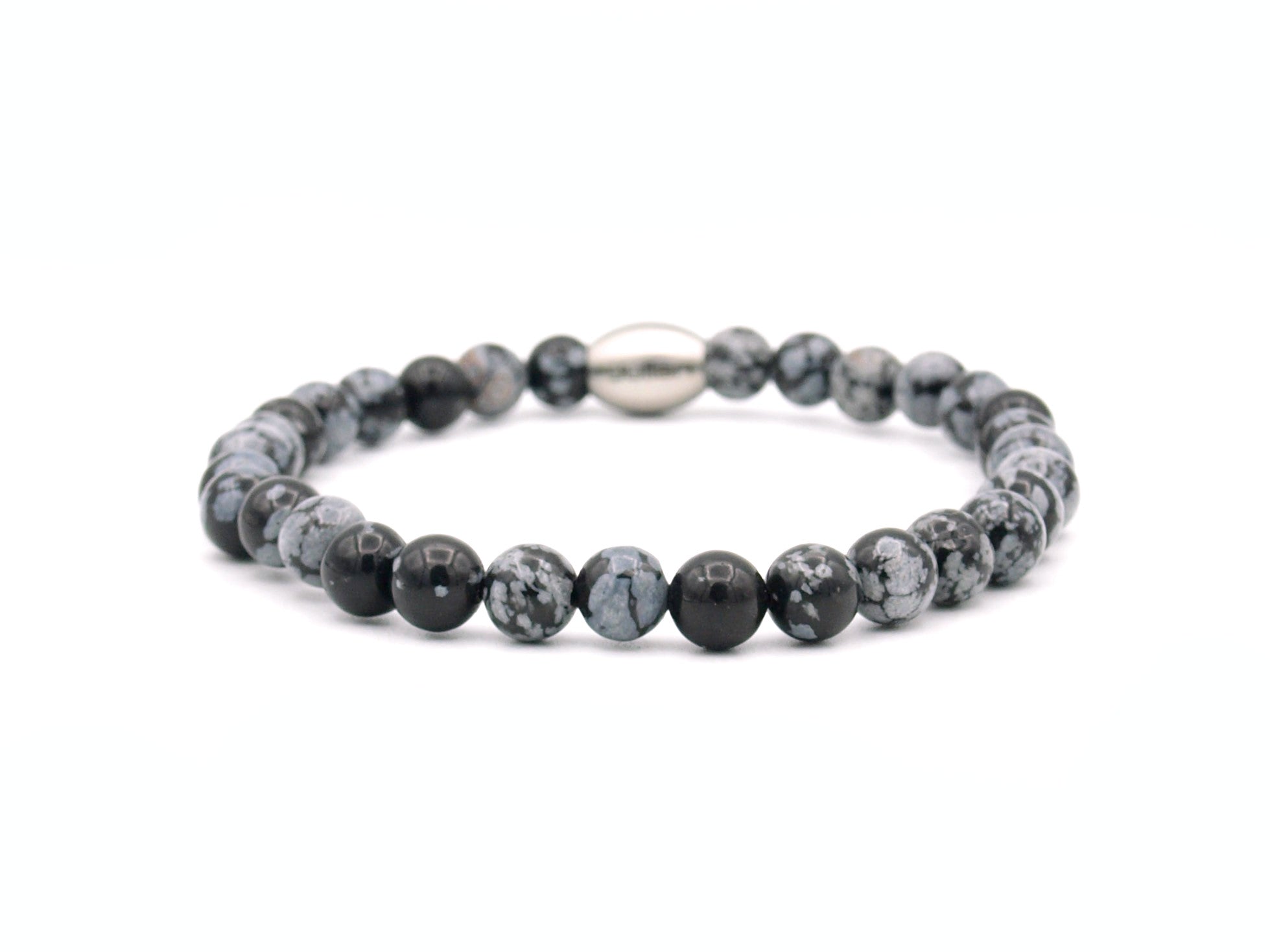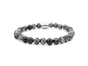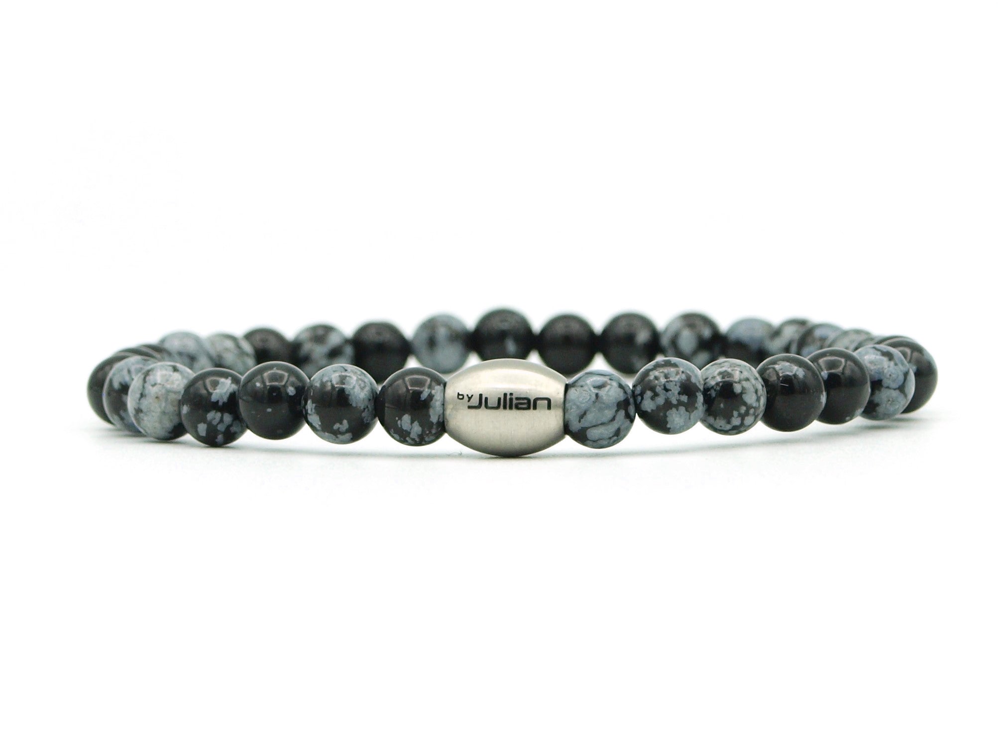 Deze heren armband is gemaakt van 8 mm sneeuwvlok obsidiaan kralen afgewerkt met een by Julian rvs logokraal geregen op sterk elastisch nylon draad.
