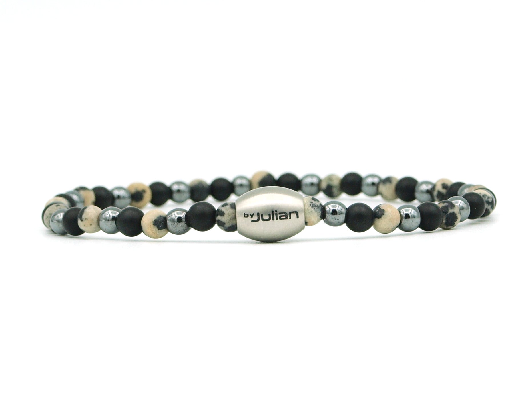 This bracelet is made of several 4 mm natural stone beads in the colour black and finished with a by Julian stainless steel logo bead strung on strong elastic nylon thread.