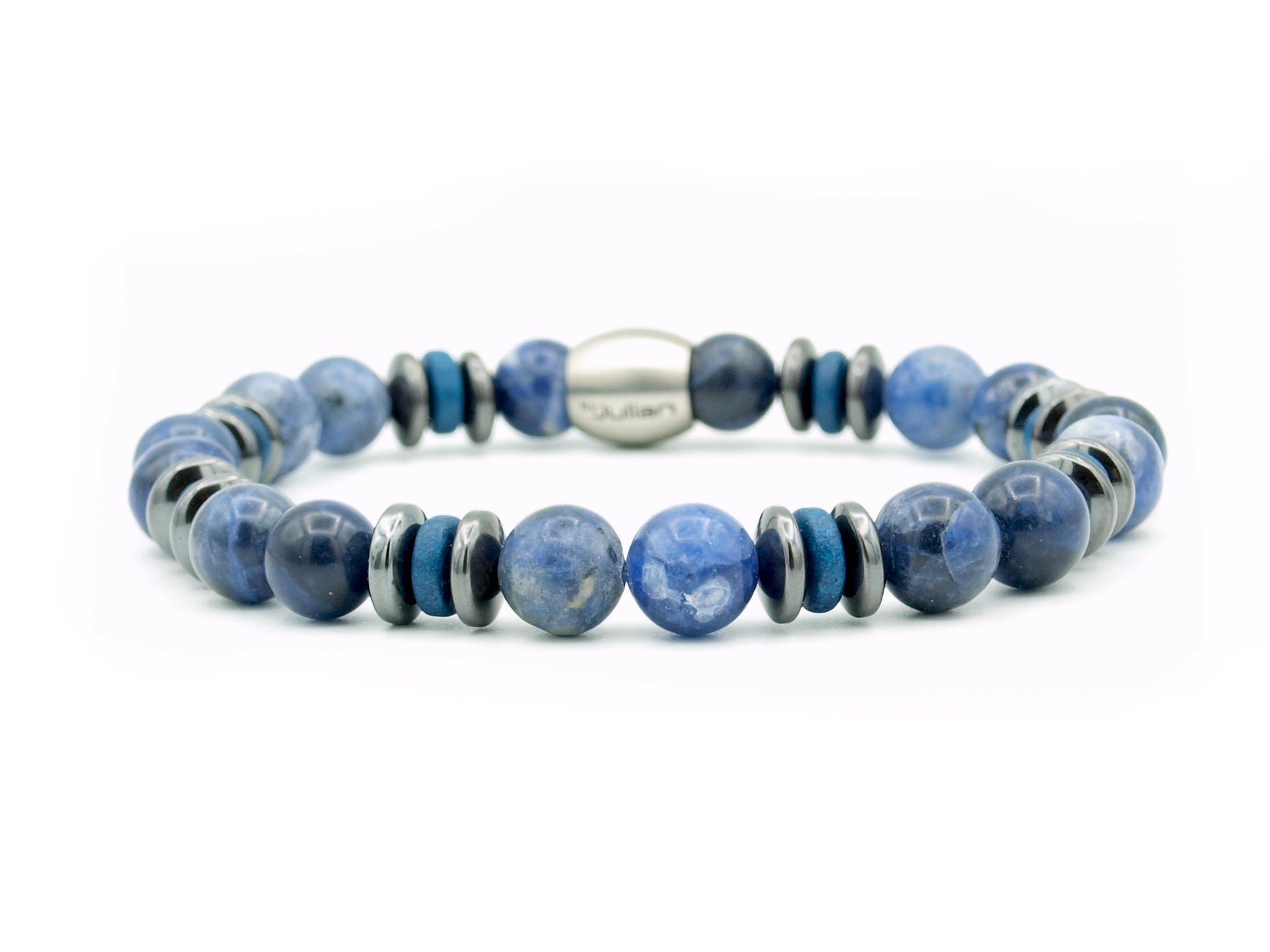 This bracelet is made of 8 mm sodalite beads, hematite and ceramic rondelles. Finished with a by Julian stainless steel logo bead and strung on strong elastic nylon thread.