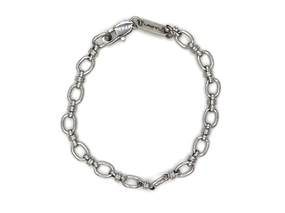 The Baja Jankar is a bold and robust bracelet, crafted from premium silver stainless steel. Its anchor chain design (9x5 mm) gives the bracelet a strong and masculine look, finished with the refined by Julian logo tag.