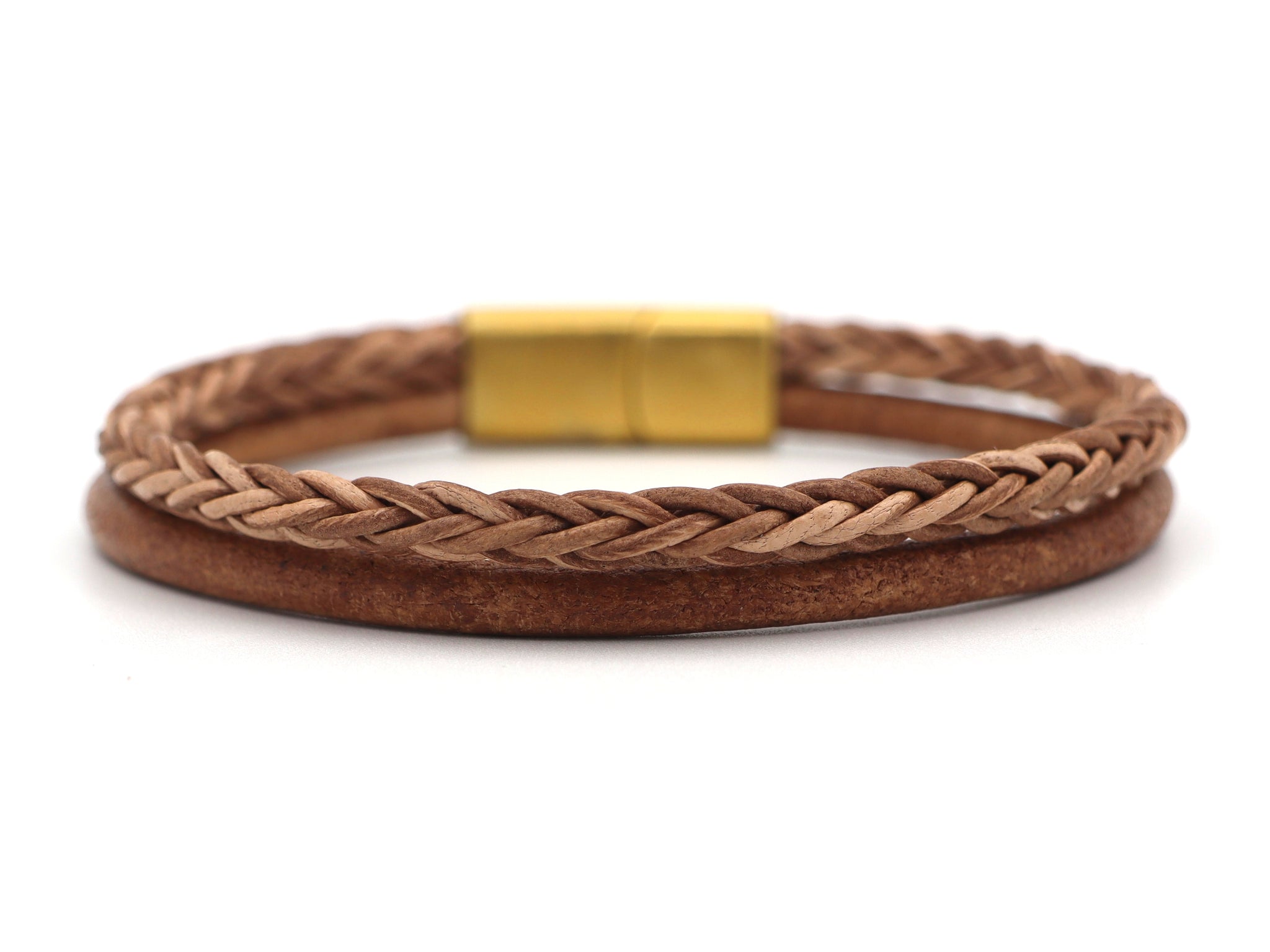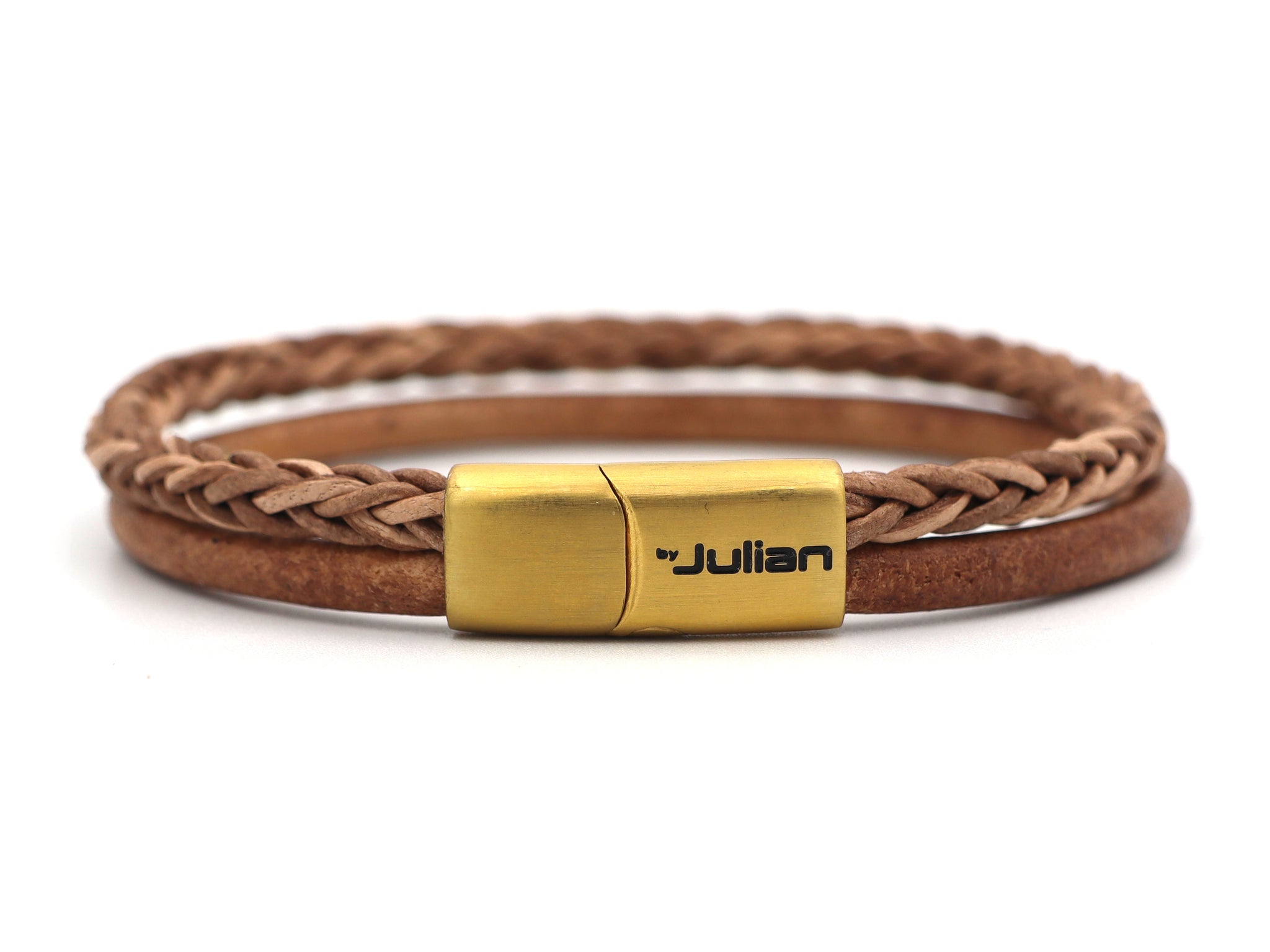 This men's bracelet is made of two 4mm braided leather in the colour natural and closes with a by Julian gold plated stainless steel sliding clasp. Also available in a silver clasp