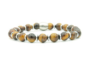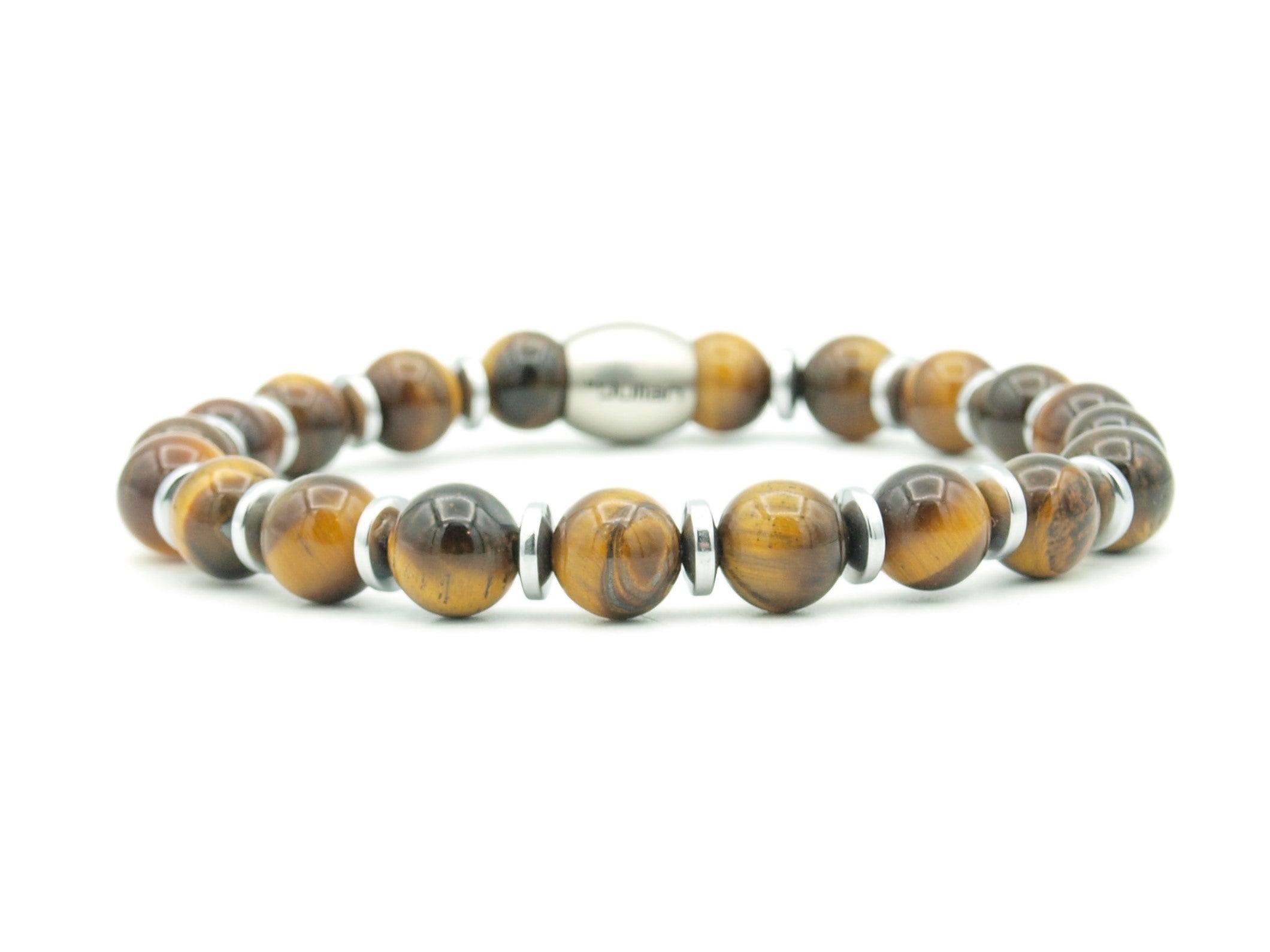 This bracelet is made of 8 mm tiger's eye beads and silver or gold hematite rondelles. Finished with a by Julian stainless steel logo bead and strung on strong elastic nylon thread.
