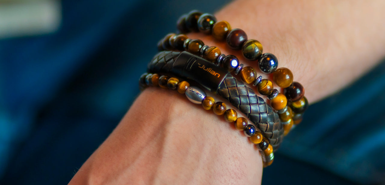 We use different types of materials for our bracelets. We often work with leather, wood, natural stone and stainless steel