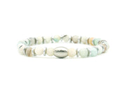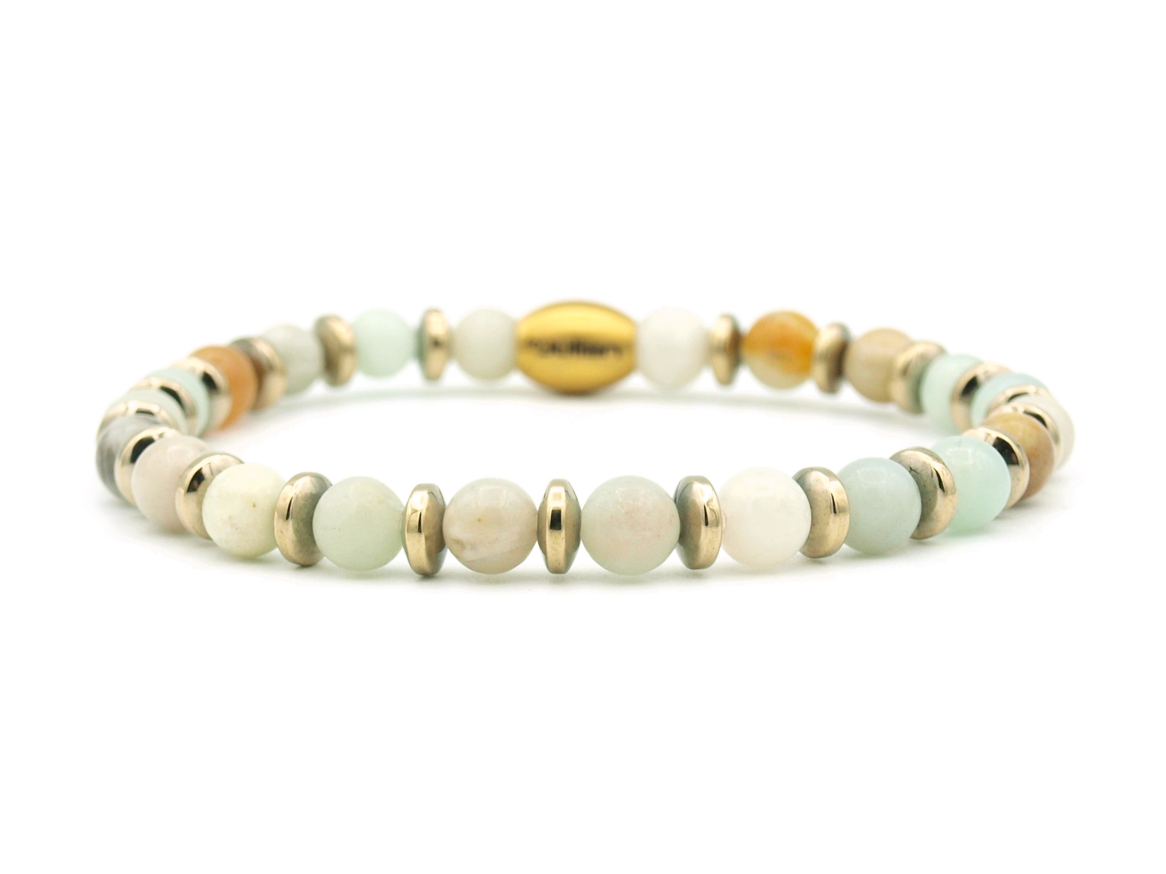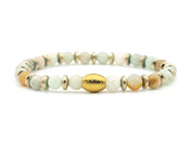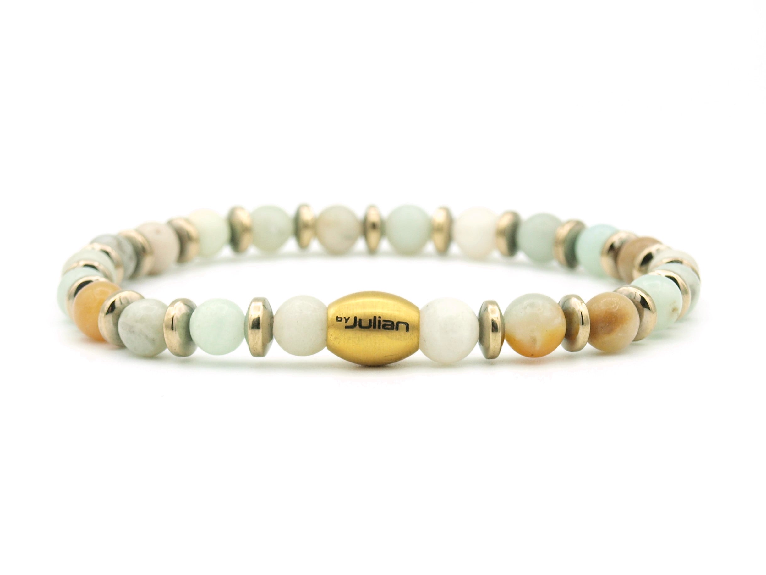 This bracelet is made of 6 mm amazonite beads and silver or gold hematite rondelles. Finished with a by Julian stainless steel logo bead and strung on strong elastic nylon thread.