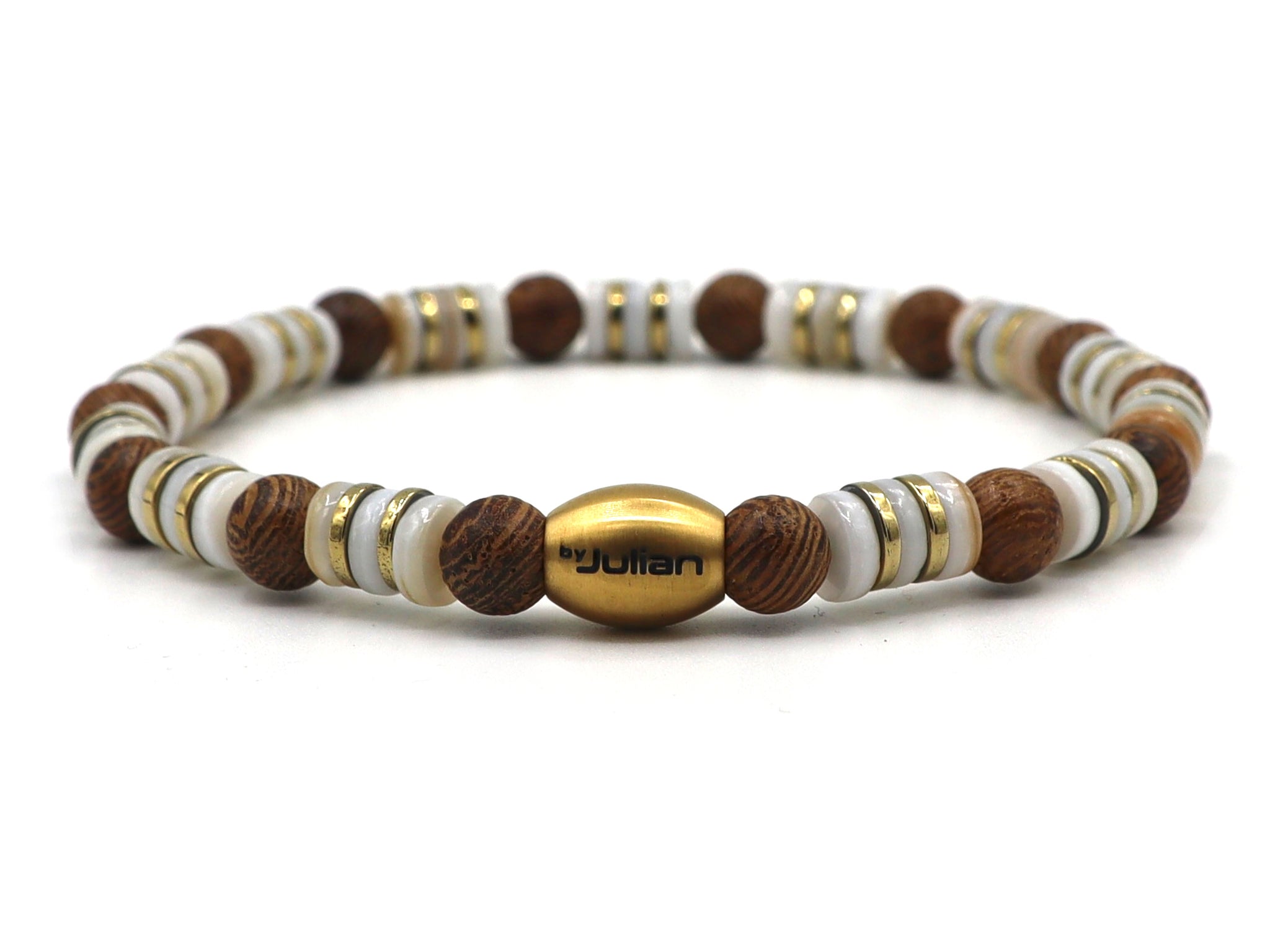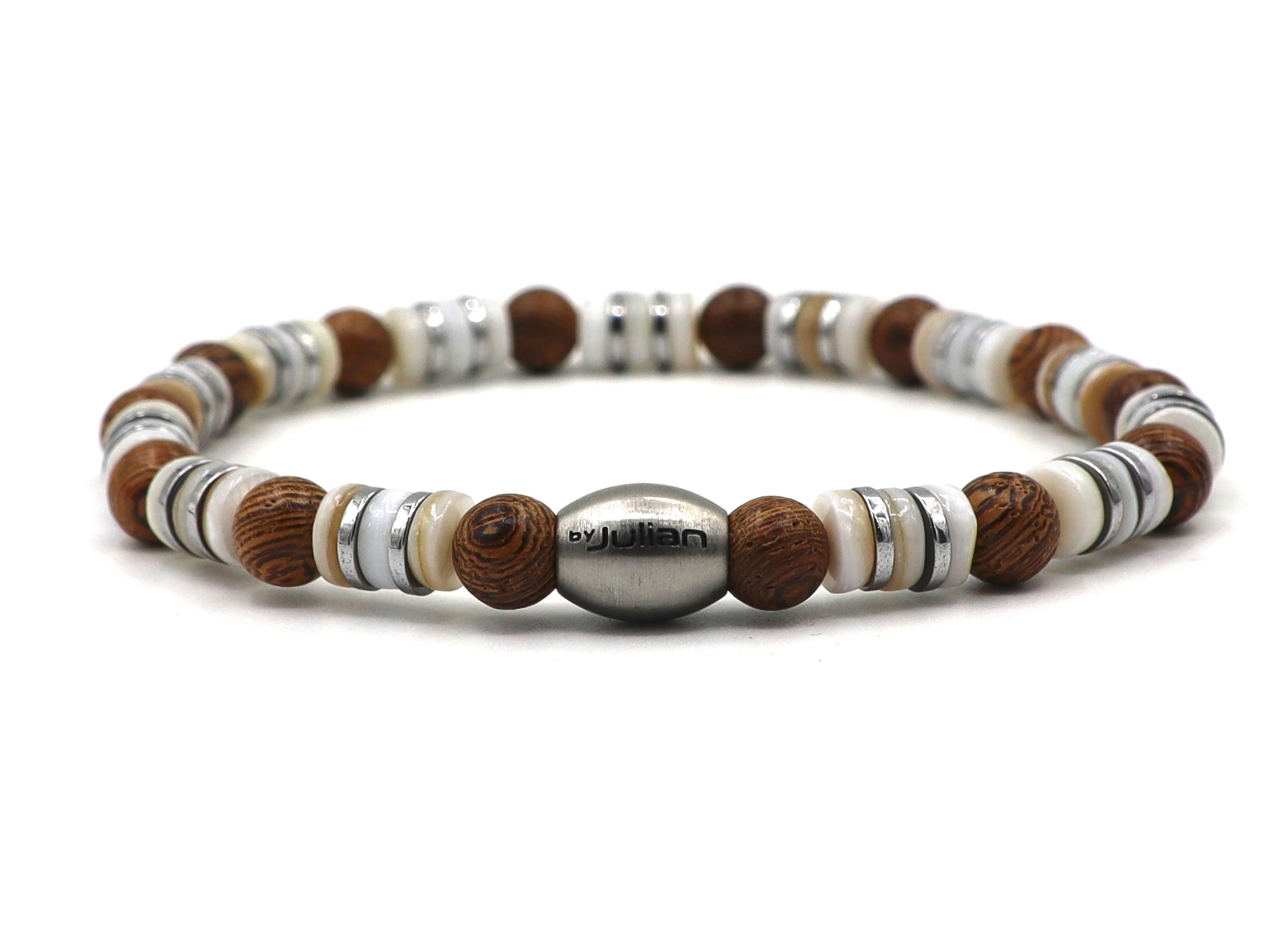 Made from 6 mm natural shell rondelles, combined with hematite rondelles in gold or silver and wooden beads. The stainless steel by Julian logo bead completes the design. Since shell and wood are natural materials, each bracelet is unique.