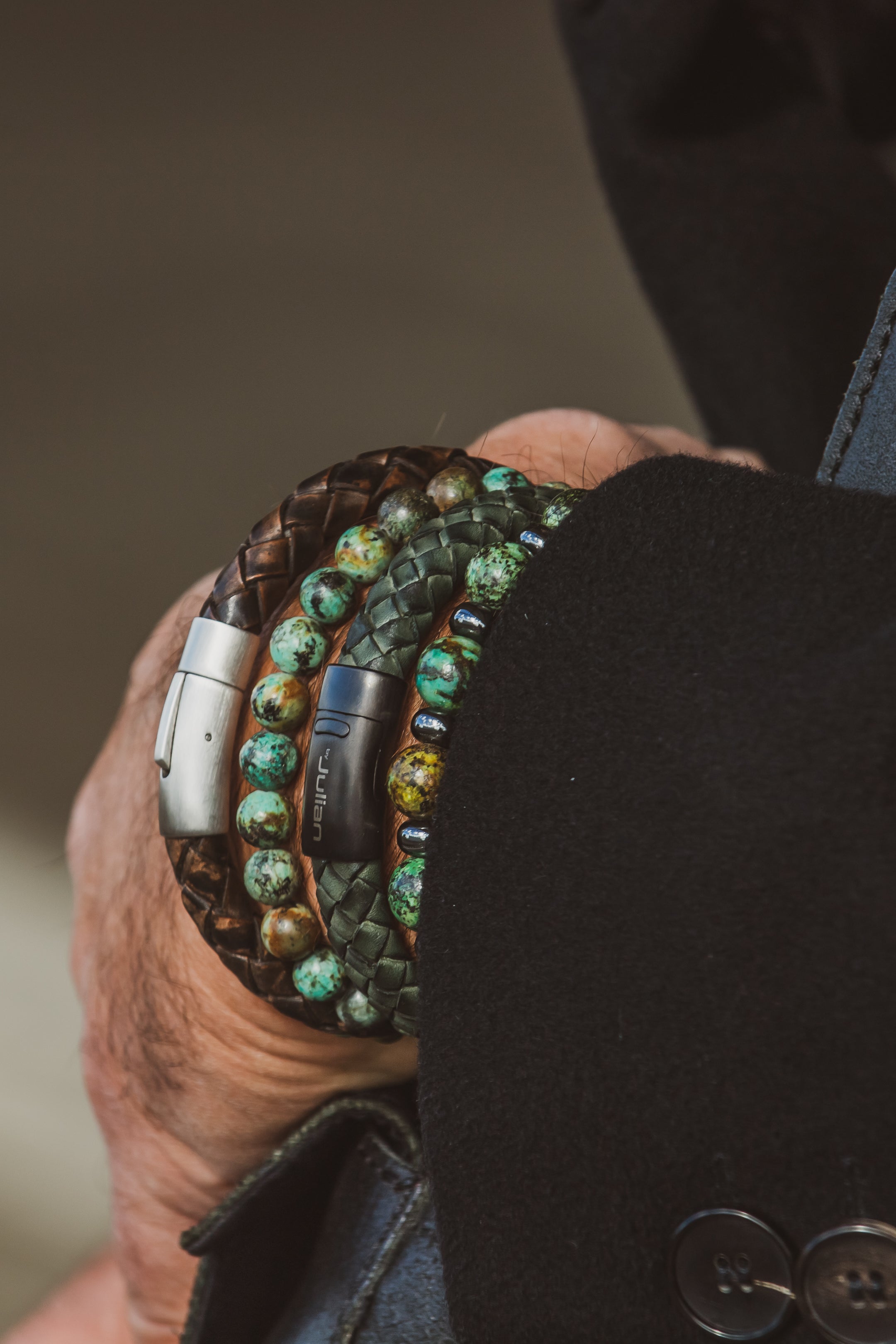 We use different types of materials for our bracelets. We often work with leather, wood, natural stone and stainless steel