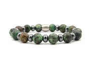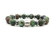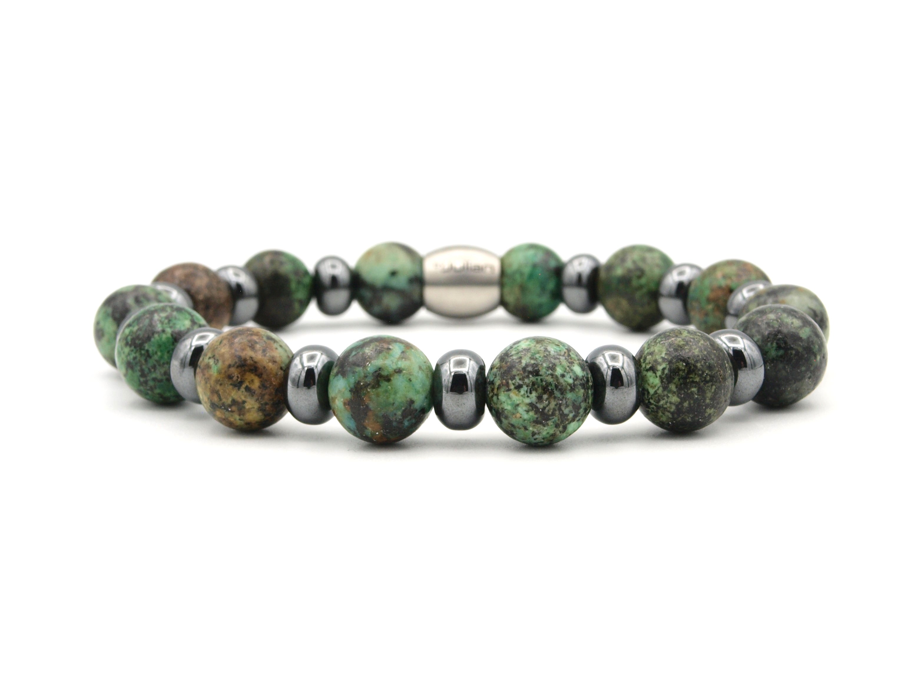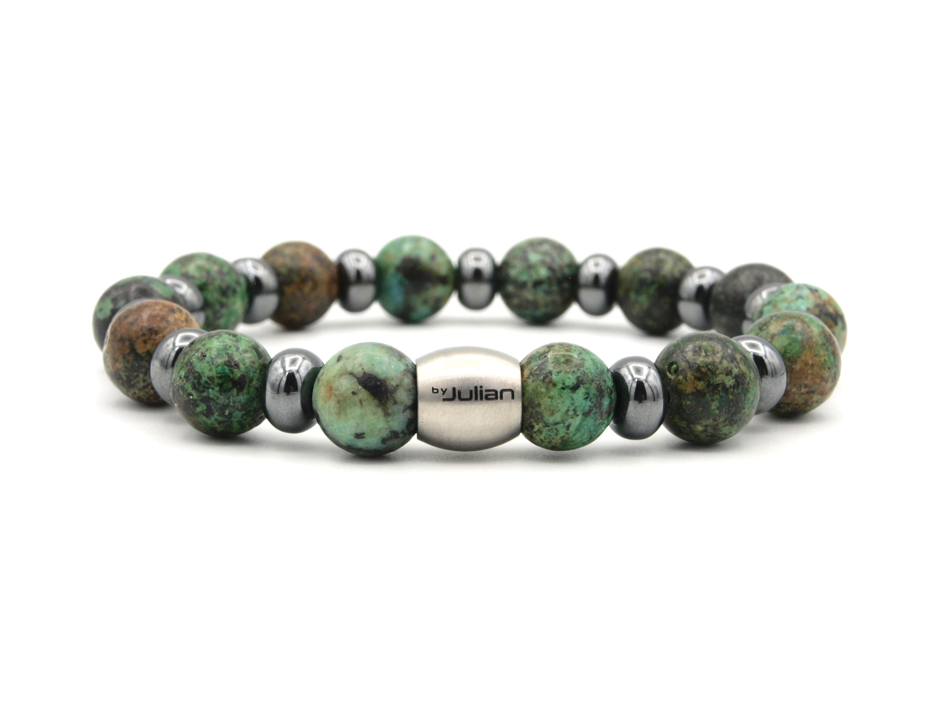 This men's bracelet is made of 10 mm African turquoise and 8 mm hematite rondelles. Finished with a by Julian stainless steel logo bead and strung on strong elastic nylon thread.