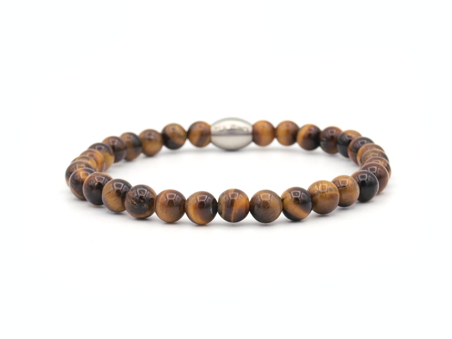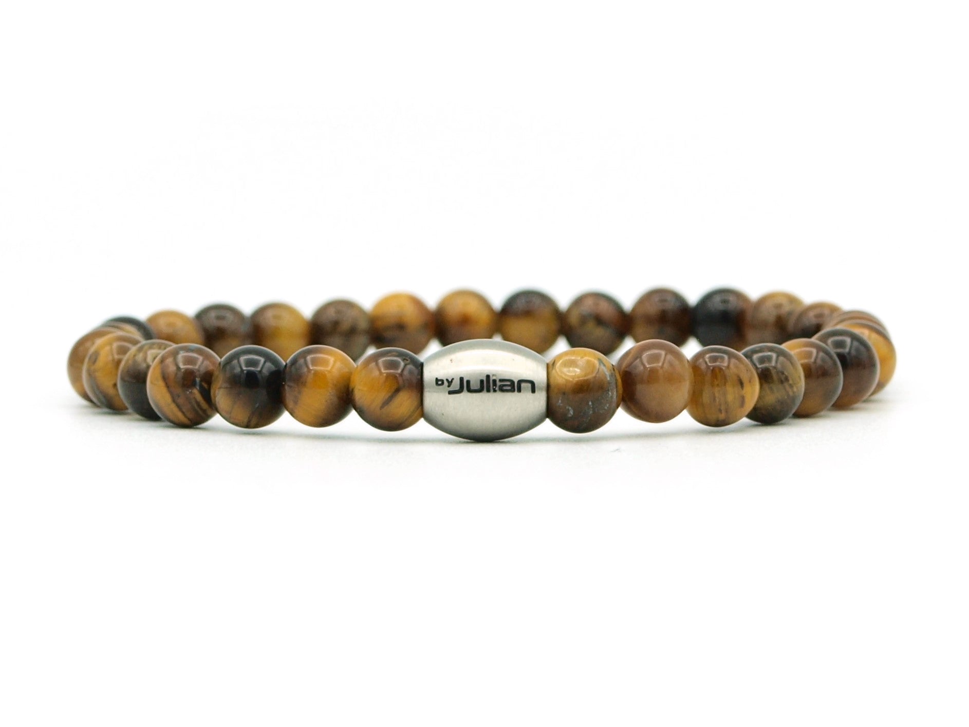 Deze heren armband is gemaakt van 6mm tijgeroog kralen afgewerkt met een by Julian rvs logokraal geregen op sterk elastisch nylon draad.