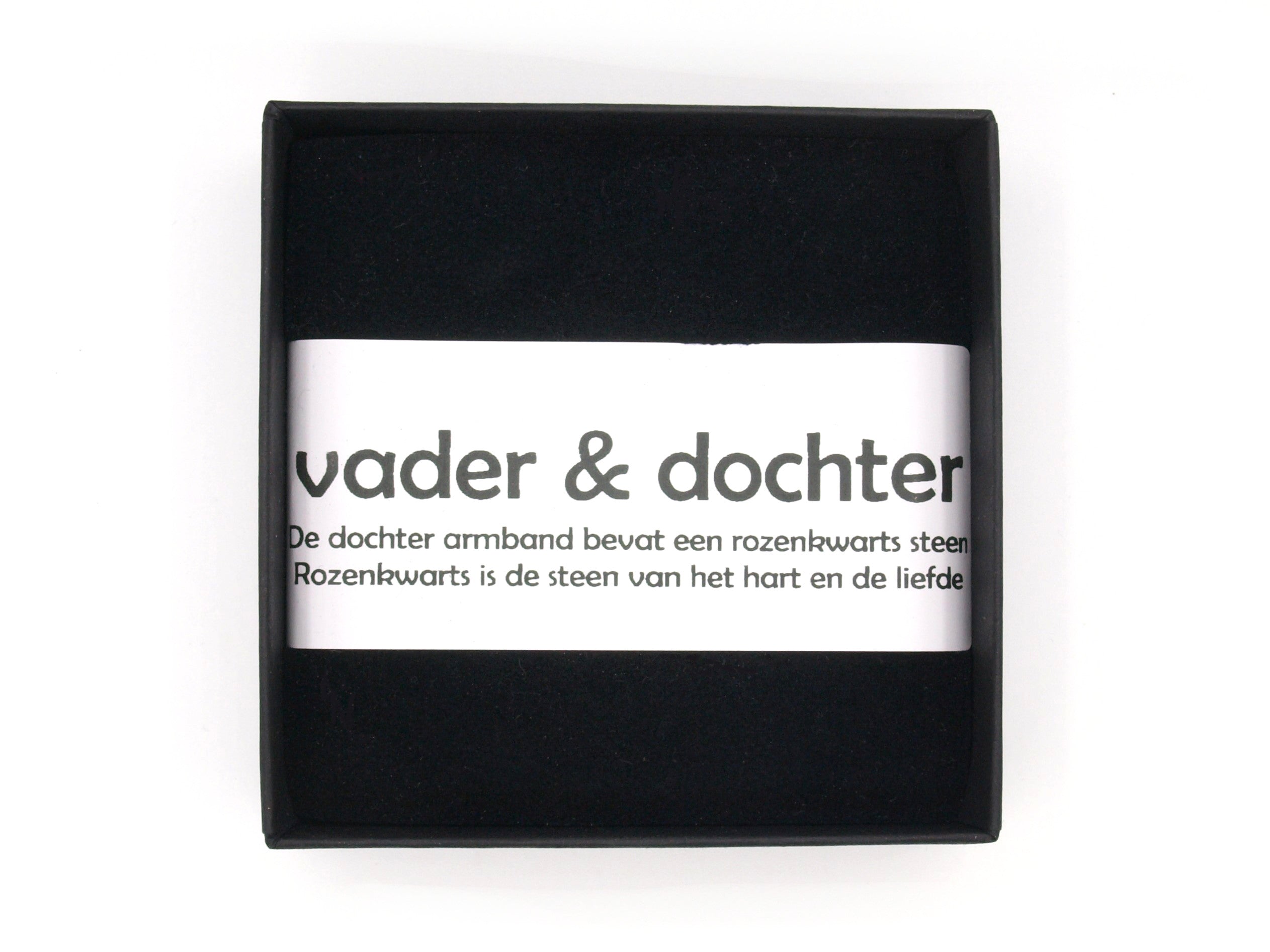 Deze armbanden zijn gemaakt van larvikiet kralen en afgewerkt met een by Julian rvs logo kraal. De dochter armband heeft tevens in het midden 2 rvs kralen en een roze rozenkwarts steen. Rozenkwarts is de steen van het hart en de liefde.