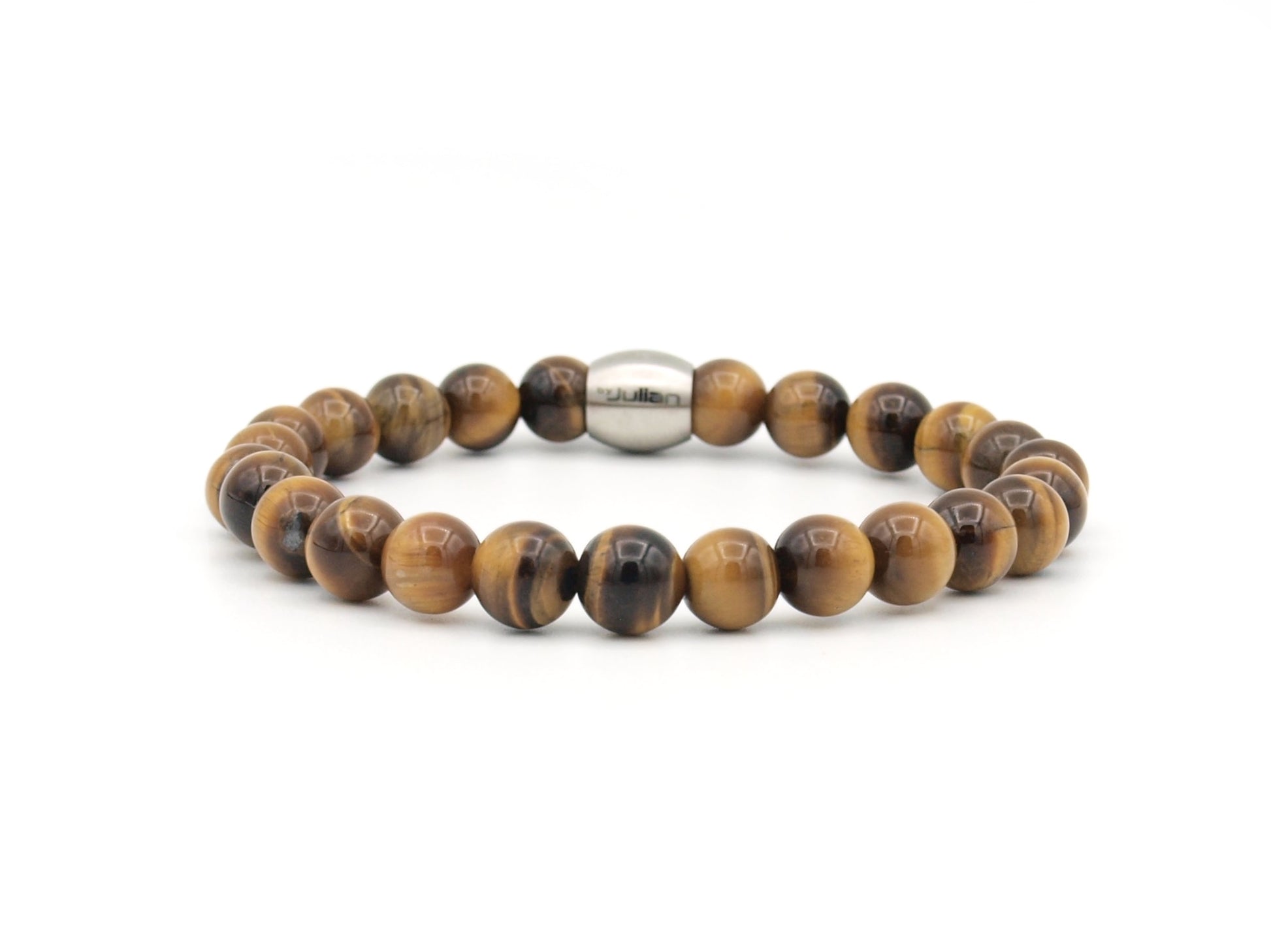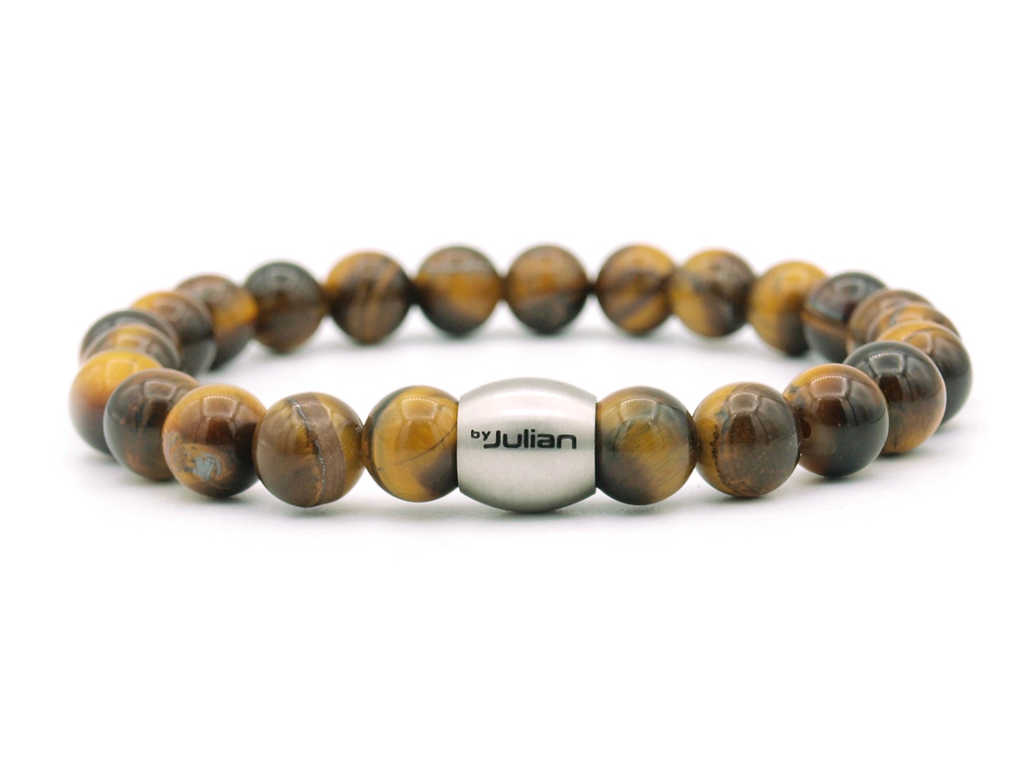 Deze heren armband is gemaakt van 8 mm tijgeroog kralen afgewerkt met een by Julian rvs logokraal geregen op sterk elastisch nylon draad.