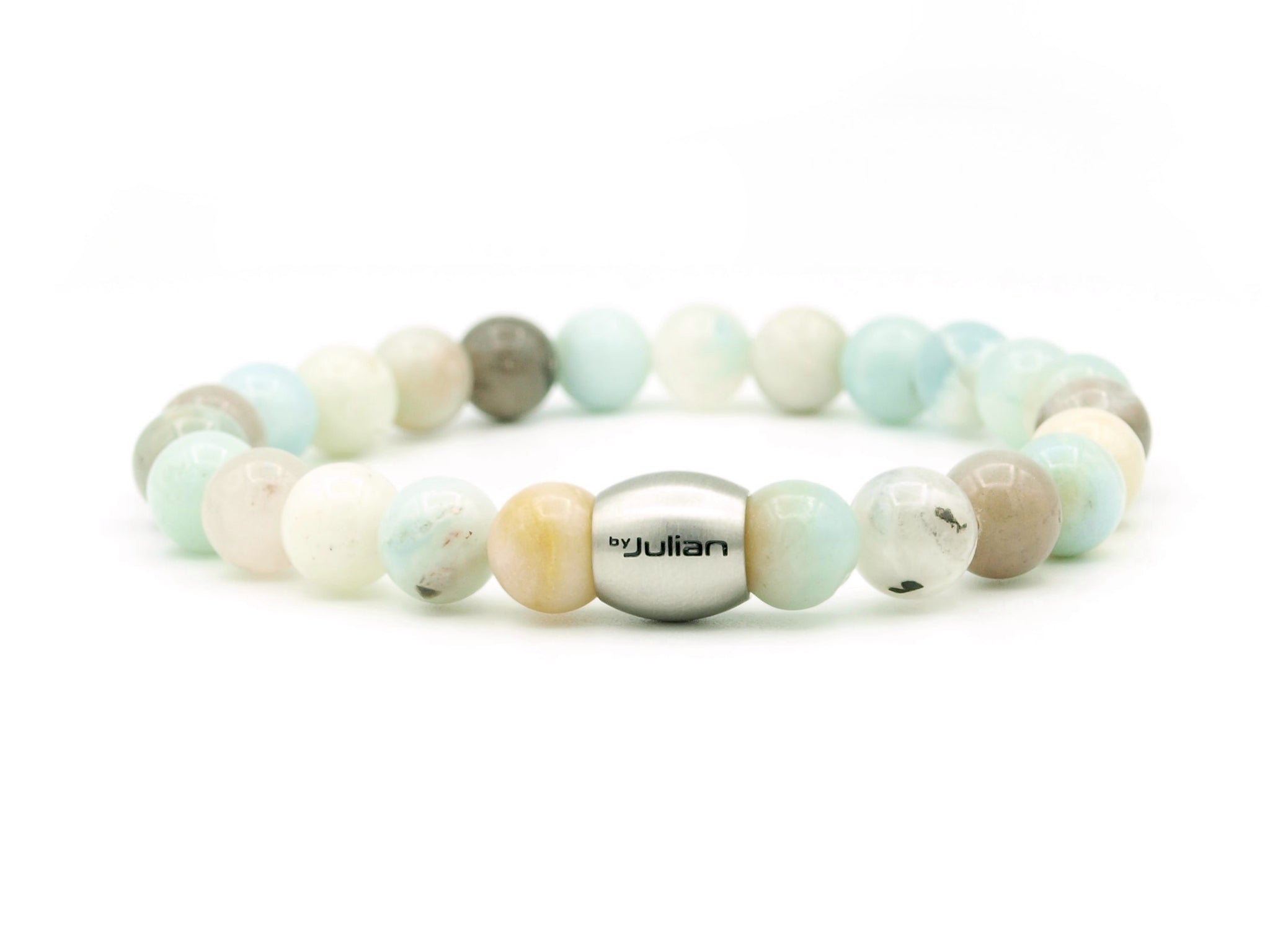 Deze heren armband is gemaakt van 8 mm Amazoniet kralen afgewerkt met een by Julian rvs logokraal geregen op sterk elastisch nylon draad.